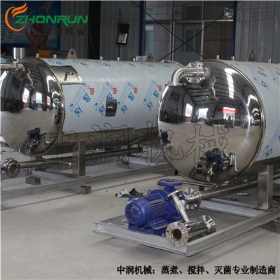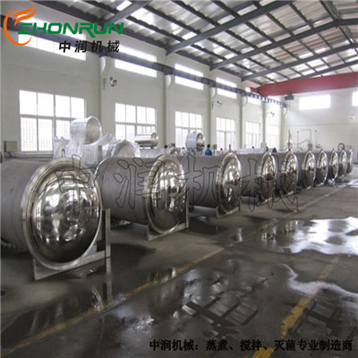一般罐頭食品廠對(duì)罐頭作常壓水煮加熱殺菌處理時(shí)都采用本形式的臥式殺菌鍋,本設(shè)備通過引入壓縮空氣可實(shí)現(xiàn)反壓殺菌。如冷卻需在鍋內(nèi)進(jìn)行,須用水泵打入鍋頂部的噴水管(或采用水循環(huán)系統(tǒng))。 在殺菌時(shí),由于加熱使罐頭溫度升高,罐頭內(nèi)壓力會(huì)超過罐外(在鍋內(nèi))的壓力。因此,為了避免殺菌時(shí)玻璃瓶罐內(nèi)增壓而跳蓋,對(duì)馬口鐵罐兩端面凸出,必須施加反壓力,特別是對(duì)需要較高殺菌溫度的肉類罐頭更就如此。 使用反壓力殺菌,即是用壓縮空氣通入鍋內(nèi)增加壓力,防止罐頭凸罐和跳蓋,其操作情況分述如下:由于壓縮空氣是不良導(dǎo)熱體,況蒸汽本身又具有一定的壓力。因此,在殺菌時(shí)升溫過程中,不放進(jìn)壓縮空氣,而只在達(dá)到殺菌溫度后處于保溫時(shí),才開放壓縮空氣入鍋內(nèi),使鍋內(nèi)增加 0.5 ~ 0.8 個(gè)大氣壓。特經(jīng)過殺菌后,降溫冷卻時(shí),停止供應(yīng)蒸汽,將冷卻水壓入噴水管。由于鍋內(nèi)溫度下降,蒸汽冷凝,而使鍋內(nèi)力降低采用壓縮空氣的壓力來補(bǔ)償。 在殺菌過程中,應(yīng)注意最初排氣,進(jìn)而泄汽,使蒸汽流通。亦可每隔15-20分鐘放氣一次,促進(jìn)熱交換。總之必須滿足殺菌條件的規(guī)定,按一定程序進(jìn)行,殺菌溫度的高低,殺菌壓力的大小,殺菌時(shí)間的長(zhǎng)短和操作方法等均由罐頭產(chǎn)品殺菌工藝作出具體規(guī)定。